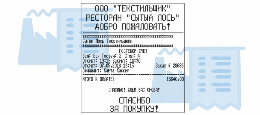 Ресторанный чек, образец которого вы можете отметить на нашем сайте, содержит последующие данные: 1. дату и момент выдачи чека; 2. список заказанных блюд; 3. их стоимость; 4. сведения о лице, напечатавшего для вас акт; 5. подпись уполномоченного лица, печать фирмы.